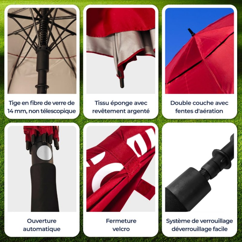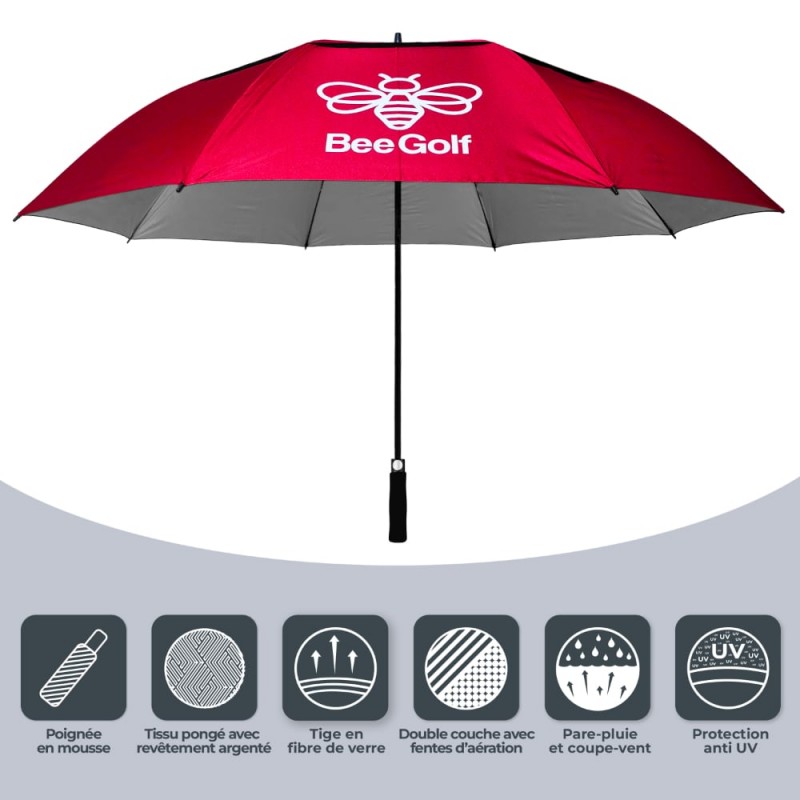 Protégez-vous sur le parcours avec le parapluie rouge BeeGolf. Conçu pour offrir une protection contre la pluie et le soleil, cet accessoire élégant est un indispensable sur le green. Commandez dès maintenant chez 50balles pour rester au sec et confortable pendant votre partie de golf!